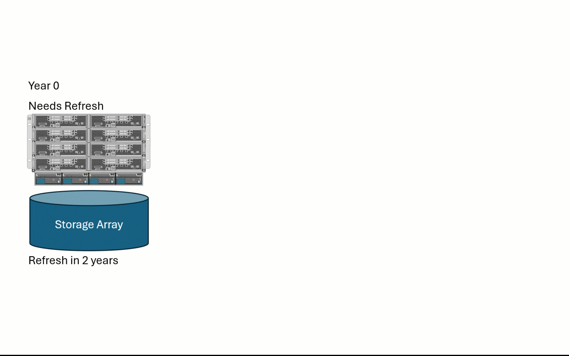 In year 2 is when things get interesting. The storage array is up for refresh. So what does a customer need to do here? Purchase drives to put in the C220 servers for persistent storage to gain the ability to install Nutanix. There's a direct tie back to the initial purchase of the servers in Year 1 here (mentioned above). Because the customer planned ahead, there's no need to physically open each server to insert the M.2 drives and storage controllers. The only thing a customer needs to do is physically insert the drives in the front of the servers.